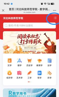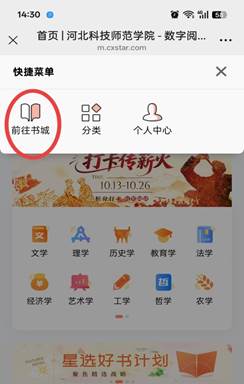 校园网内的读者可直接进行选书荐购。点击右上角菜单图标展开快捷菜单,点击“前往书城”。
