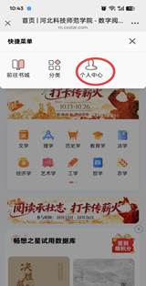 校园网外的读者需要校内认证后方可校外使用,校园网内点击右上角快捷菜单——【个人中心】进入,认证图书馆【河北科技师范学院】成功即可实现校外荐购及阅读。