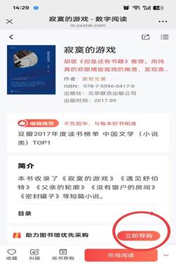 电脑端:读者在校园网内登录图书馆主页——数字资源——“畅想之星电子书”,或直接点击网址https://www.cxstar.com/进入平台,点击喜欢的图书——“立即荐购”。校园网外可使用图书馆远程访问系统。